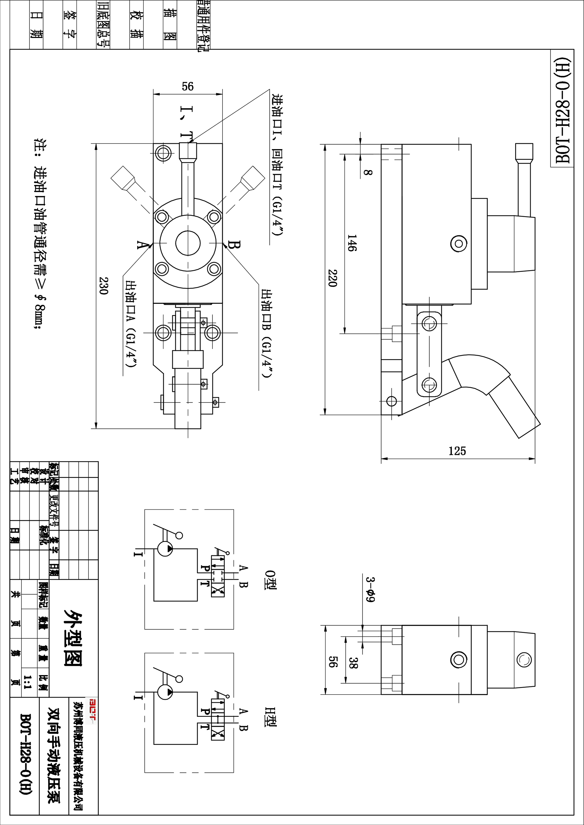 本雙向手動(dòng)液壓泵采用內(nèi)排內(nèi)泄結(jié)構(gòu)。換向集成與泵體一體,通過(guò)換向手柄轉(zhuǎn)動(dòng),可分別選擇出油A口或B口方向出油打壓,通過(guò)進(jìn)油口(回油口)吸油和回油,進(jìn)出油接口分別是G1/4;
